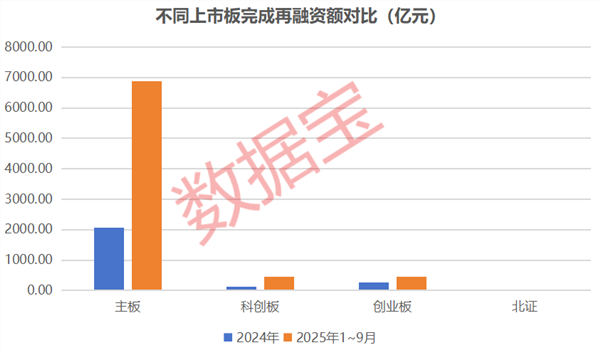从已实施的再融资来看,今年前三季度,主板再融资总额大幅超越上一年全年,接近6878亿元,主要由中国银行、邮储银行、交通银行及建设银行4大国有行定增募资5200亿元贡献。