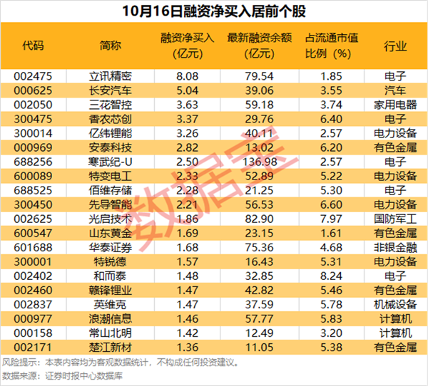 具体到个股,10月16日获融资净买入千万元以上的有498只,其中36股融资净买入额均超1亿元。