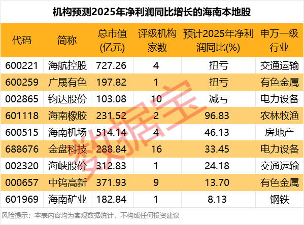 根据机构一致预测,2025全年净利润预计向好的海南本地股共计9只。其中,海南橡胶、海南机场、金盘科技、海峡股份净利润增幅居前,依次为96.83%、46.13%、33.45%、24.18%;海航控股和广晟有色预计全年实现扭亏为盈。