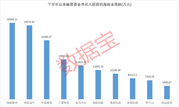 据证券时报·数据宝统计,下半年以来(截至10月16日),融资资金净买入额超过5000万元的海南本地股有10只,海峡股份、洲际油气、中钨高新排名前三,对应金额依次为3.04亿元、2.94亿元、2.35亿元;广晟有色、海马汽车、海航控股、海南机场融资净买入额也在1亿元以上。