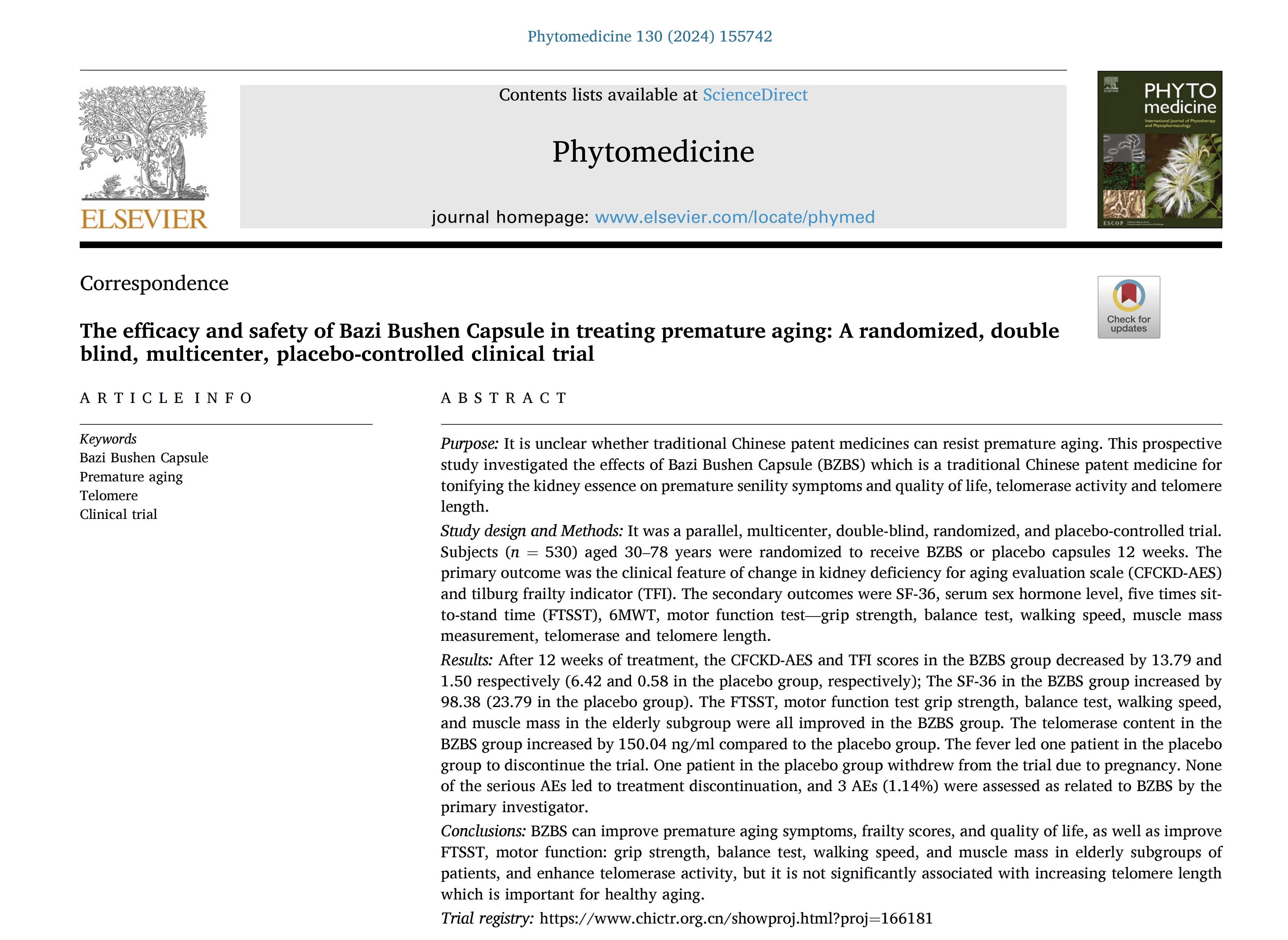 在临床层面,围绕八子补肾胶囊开展的530例随机、双盲、安慰剂对照、多中心人体循证研究,开创中药抗衰老领域大型临床试验先河。该研究显示,服用八子补肾胶囊12周后,受试者衰老症状显著改善,躯体及心理状态提升,运动耐力和生活质量提高。尤为突出的是,受试者端粒酶活性(国际公认的抗衰老生物标志物)较对照组提高76.7%。