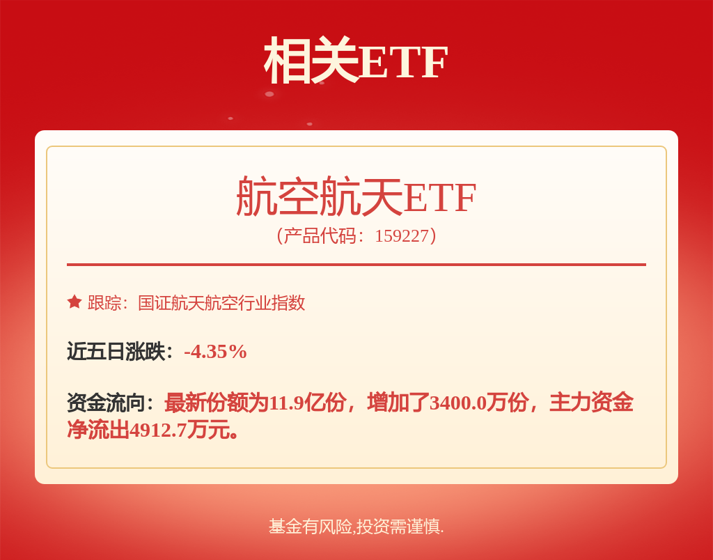 航空航天ETF(159227)跟踪国证航天指数,申万一级军工行业占比高达98.2%,是全市场军工含量最高的指数,聚焦军工细分空天力量,成分股覆盖战斗机、运输机、直升机、航空发动机、导弹、卫星、雷达等全产业链龙头,完美契合“空天一体”的战略方向。