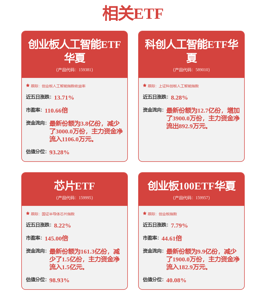 创业板人工智能ETF华夏(159381),跟踪创业板人工智能指数(970070.CNI),精准布局创业板人工智能主业公司。光模块CPO权重占比51.8%,同时覆盖国产软件+AI应用企业,具备较高弹性。其中前三大权重股为中际旭创(20.95%)、新易盛(20.42%)、天孚通信(5.39%)。场内综合费率仅0.20%,位居同类最低。场外联接(A类:025505;C类:025506)5G通信ETF(515050)跟踪中证5G通信主题指数,最新规模超80亿元。深度聚焦英伟达、苹果、华为产业链。全称:华夏中证5G通信主题ETF(515050),场外联接(A类:008086;C类:008087)。