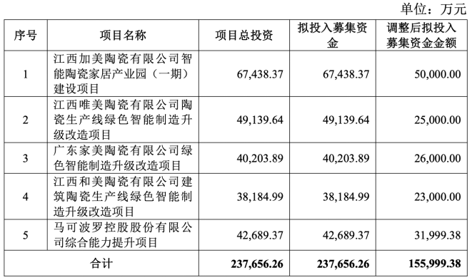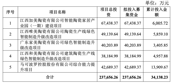 根据招股书,马可波罗原计划通过IPO募集23.76亿元,投向“江西加美陶瓷有限公司智能陶瓷家居产业园(一期)建设项目”“江西唯美陶瓷有限公司陶瓷生产线绿色智能制造升级改造项目”等五大项目。公司曾表示,这些项目将提高公司产品的生产能力,进一步强化公司研发和制造的优势,巩固公司在建筑陶瓷行业的领先地位,提高公司的综合竞争力和抗风险能力。