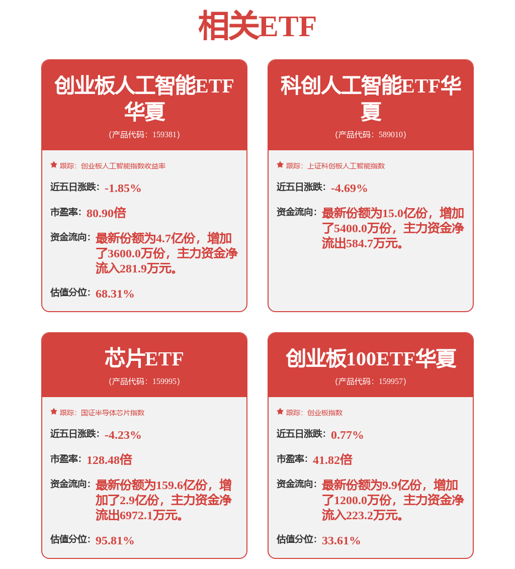 创业板人工智能ETF华夏(159381),跟踪创业板人工智能指数(970070.CNI),精准布局创业板人工智能主业公司。光模块CPO权重占比51.8%,同时覆盖国产软件+AI应用企业,具备较高弹性。其中前三大权重股为中际旭创(20.95%)、新易盛(20.42%)、天孚通信(5.39%)。场内综合费率仅0.20%,位居同类最低。场外联接(A类:025505;C类:025506)