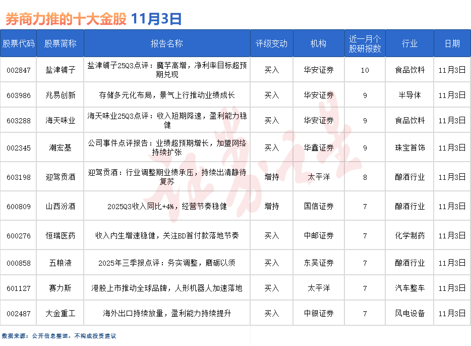 盐津铺子最受券商关注,近一个月获太平洋、东兴证券、开源证券、国信证券、海通国际、华鑫证券、信达证券等10份券商研报关注,位居11月3日券商力推股榜首。