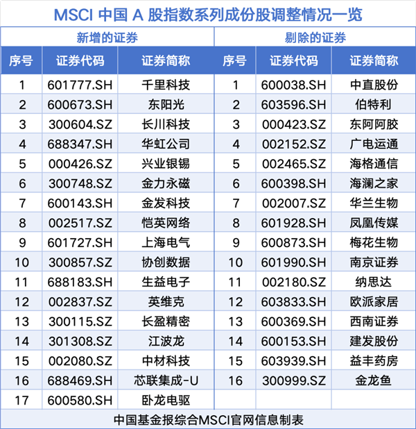 MSCI中国A股指数系列方面,将新增千里科技、东阳光、长川科技、华虹公司等17只证券,剔除东阿阿胶、海澜之家、南京证券等16只证券。