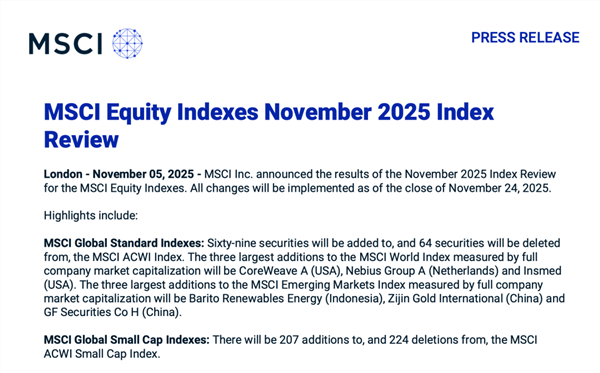 当地时间11月5日,国际指数编制公司MSCI发布11月指数调整结果,所有调整将于2025年11月24日收盘后实施。