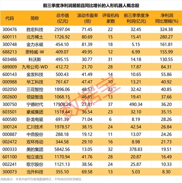 数据宝统计,2025年前三季度净利润逾5亿元且同比实现稳定增长的人形机器人概念股,共计20只。其中,胜宏科技、北方稀土、金力永磁、思特威-W、科沃斯均实现翻倍增长,净利润增幅依次为324.38%、280.27%、161.81%、155.99%、130.55%。