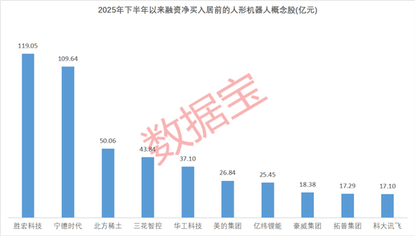 据证券时报·数据宝统计,2025年下半年以来(截至11月4日),融资净买入额超10亿元的人形机器人概念股有15只,胜宏科技、宁德时代、北方稀土、三花智控、华工科技排名前五,对应金额依次为119.05亿元、109.64亿元、50.06亿元、43.84亿元、37.1亿元。