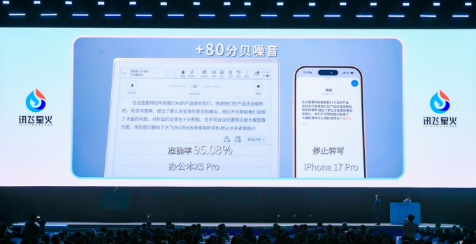 在听觉交互方面,依托独家“AI+麦克风阵列技术”,讯飞智能办公本X5首创上4下4环八麦克风阵列,具备卓越的抗噪性能,识别效果显著优于iPhone 17 Pro,在高噪声环境下的识别准确率高达95.08%。