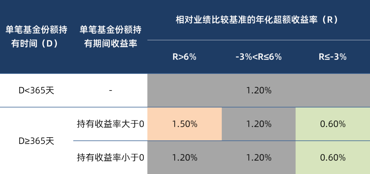 注:持有期限不足一年(即365天),则按1.20%年费率收取管理费;持有期限达到一年及以上,则根据持有期间年化收益率分为以下三种情况,分别确定对应的管理费率档位:若持有期间相对业绩比较基准的年化超额收益率在-3%及以下,按0.60%年费率确认管理费;若持有期间的年化超额收益率(扣除超额管理费后)超过6%且持有收益率(扣除超额管理费后)为正,按1.50%年费率确认管理费;其他情形按1.20%年费率确认管理费。详情请查阅本基金招募说明书、基金合同等法律文件