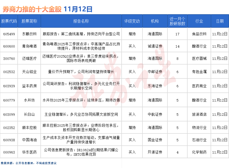 东鹏饮料最受券商关注,近一个月获太平洋、中国银河、第一创业、开源证券、中邮证券、群益证券、万联证券、西南证券等17份券商研报关注,位居11月12日券商力推股榜首。