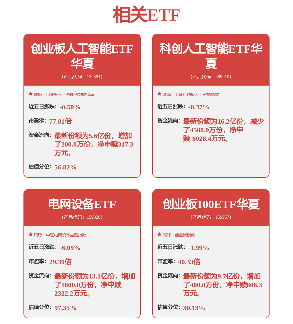 创业板人工智能ETF华夏(159381),跟踪创业板人工智能指数(970070.CNI),精准布局创业板人工智能主业公司。光模块CPO权重占比超54%,同时覆盖国产软件+AI应用企业,具备较高弹性。其中前三大权重股为中际旭创(24.78%)、新易盛(19.40%)、天孚通信(5.11%)。场内综合费率仅0.20%,位居同类最低。场外联接(A类:025505;C类:025506)