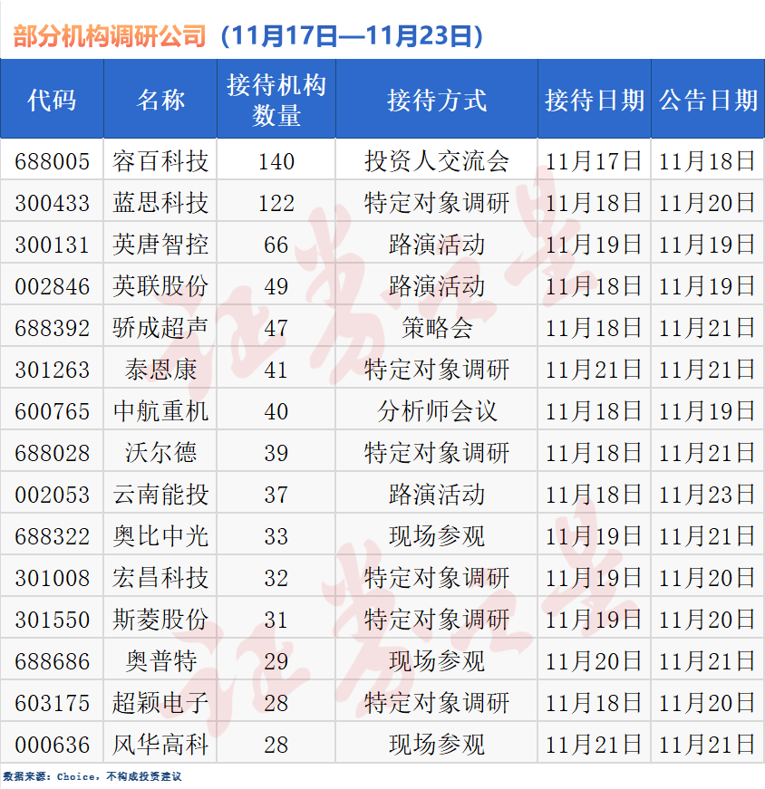 根据Choice数据的最新统计,在刚刚过去的一周(11月17日至11月23日),A股市场共有超过480家上市公司接受了各类机构的调研,调研频次与覆盖公司数量均维持在较高水平。