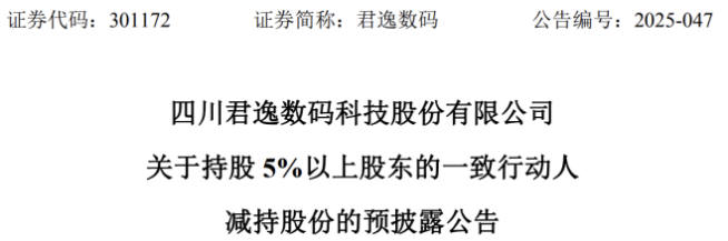 近期,君逸数码(301172.SZ)披露了公司第二大股东一致行动人成都高创投的减持计划,拟套现最高金额为4177万元。
