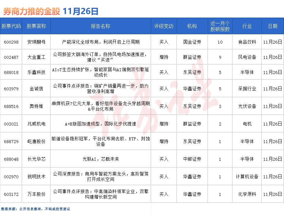 安琪酵母最受券商关注,近一个月获西南证券、群益证券、华鑫证券、民生证券、开源证券、华源证券、东吴证券等10份券商研报关注,位居11月26日券商力推股榜首。