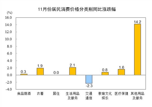 其他七大类价格同比五涨一平一降。其中,其他用品及服务、生活用品及服务、衣着价格分别上涨14.2%、2.1%和1.9%,医疗保健、教育文化娱乐价格分别上涨1.6%和0.8%;居住价格持平;交通通信价格下降2.3%。