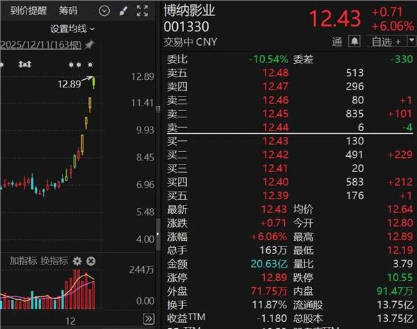 盘初,影视院线板块拉升,博纳影业(001330)盘中触及涨停,走出4连板,北京文化、中国电影、金逸影视、华策影视、幸福蓝海冲高。