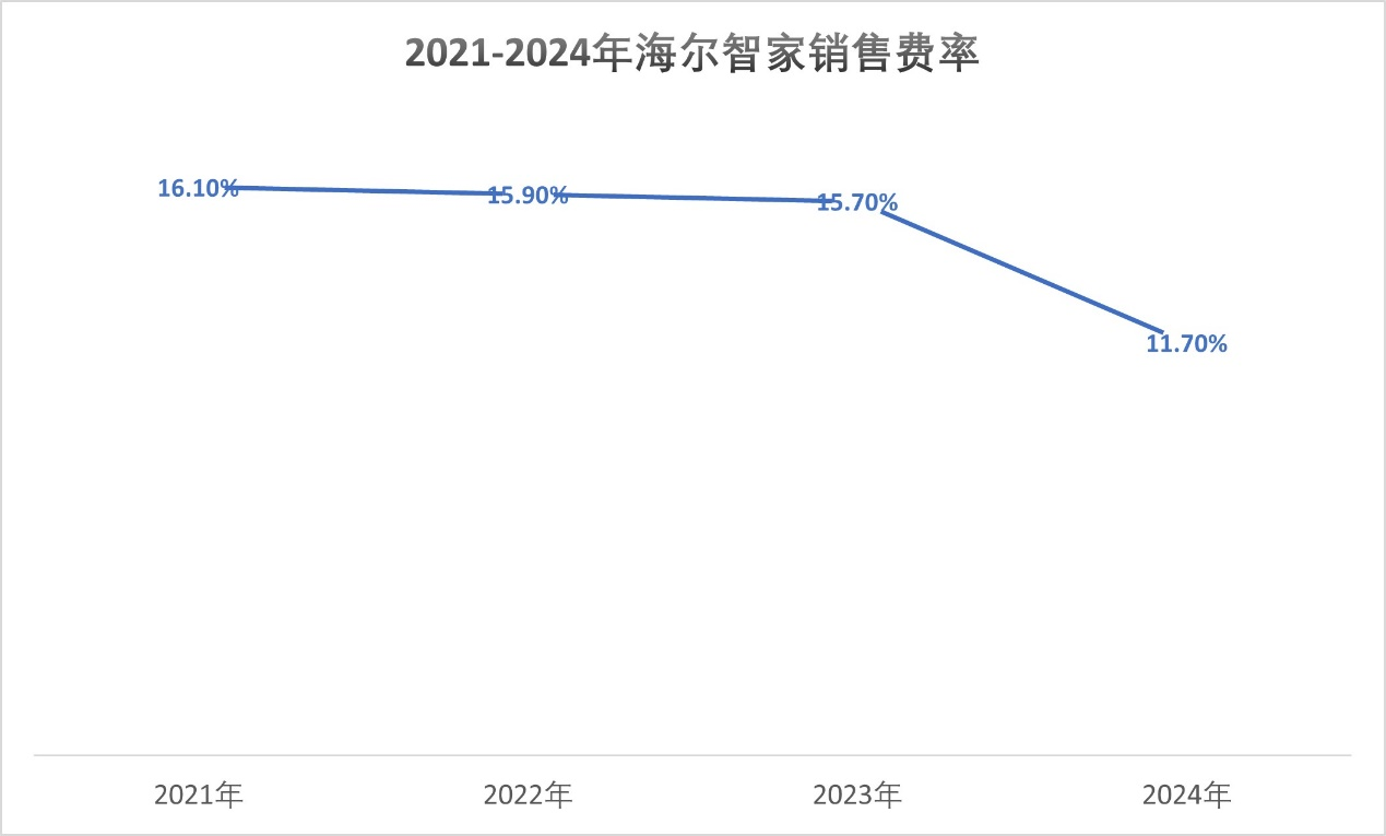 与此同时,海尔智家的销售费率却从2021年的16.1%下降至2024年11.7%,下降了4.4pct。不仅销售费率下降,销售费用也是下降的。销售费用从2021年的365亿元降到了2024年的335亿元,降了30亿元。