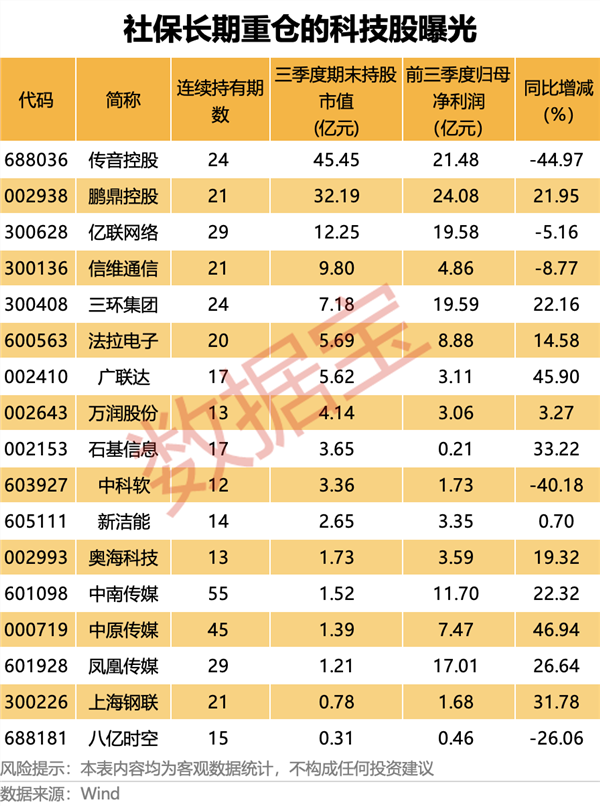 除了上述个股外,还有11只科技股获社保基金重仓3年以上。其中,鹏鼎控股期末持股市值超32亿元。