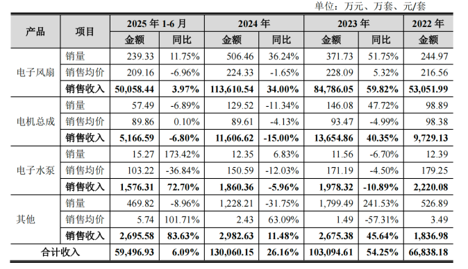 报告期内,电子风扇作为营收支柱,收入占比始终超过80%。该产品各期销售均价分别为216.56元/套、228.09元/套、224.33元/套和209.16元/套。可见,该核心产品单价自2024年起持续下滑,尽管产品降价,销量并未相应放量,导致该板块收入增速逐步放缓。