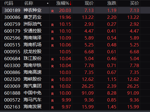 概念板块方面,海南自贸区概念板块也掀起涨停潮。神农种业“20cm”涨停,康芝药业、安通控股、海南瑞泽、海南机场、欣龙控股、海南高速、海峡股份等多股盘中涨停。