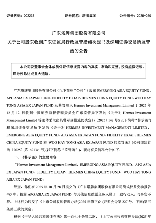 日前,粤东水泥龙头塔牌集团(002233.SZ)因一致行动人认定不准确,被广东证监局出具警示函、深交所下发监管函。