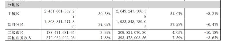 证券之星注意到,今年上半年,来自核心区域的收入继续失守,主城区收入同比下滑8.21%,郊县分区和二级市区的收入分别同比下滑6.47%和10.18%,区域增长动力持续减弱。
