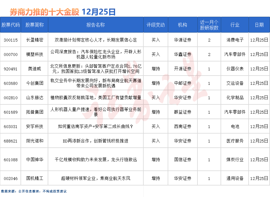长盈精密最受券商关注,近一个月获中邮证券等2份券商研报关注,位居12月25日券商力推股榜首。