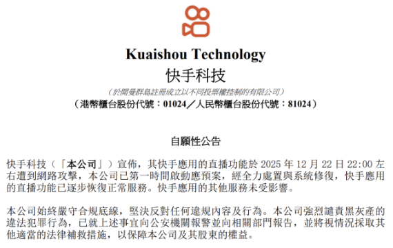 12月23日上午,快手发布声明称,快手应用的直播功能于2025年12月22日22:00左右遭到网络攻击,公司已第一时间启动应急预案,经全力处置与系统修复,快手应用的直播功能已逐步恢复正常服务。同时,公司已就此事向公安机关报案并向有关部门上报,并将视情况采取进一步法律措施。