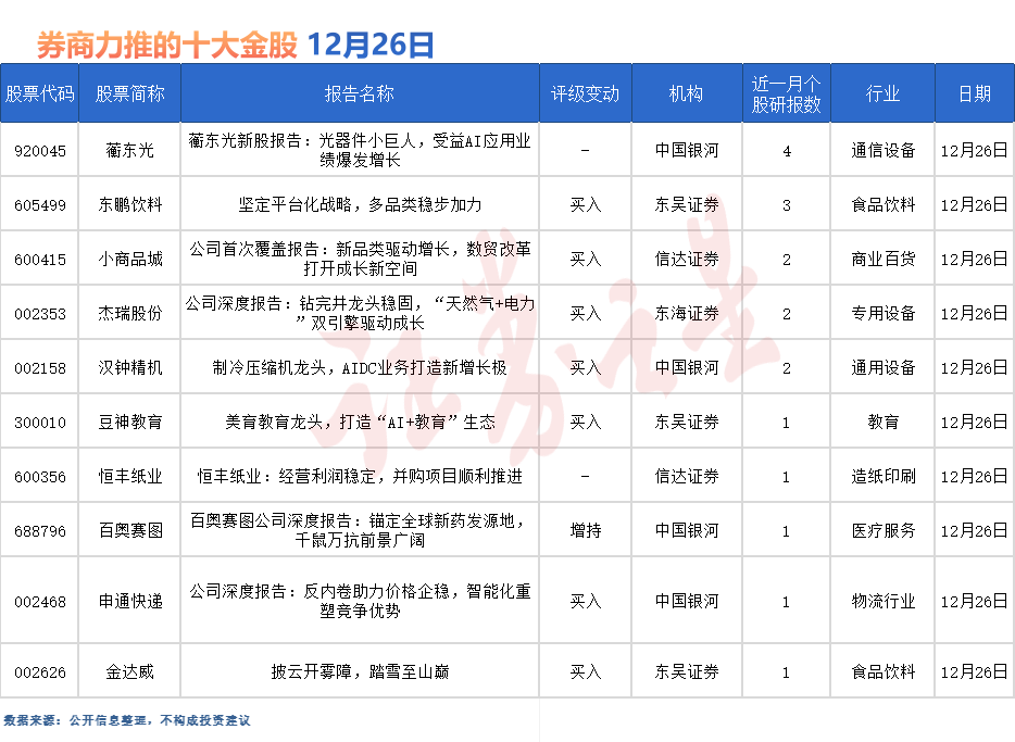 据证券之星数据库不完全统计,12月26日券商共给予超10家A股上市公司“买入”评级。从行业分布看,券商12月26日关注的个股聚焦于通信设备、食品饮料、商业百货、专用设备、教育、造纸印刷、医疗服务、物流、食品饮料等行业。