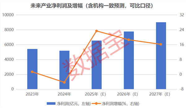 未来产业展现出了强大的增长动能。据证券时报·数据宝统计,上文提及的7个未来产业共涉及381家公司,这些公司2023年、2024年净利润整体增幅(可比口径,下同)偏弱,且2024年净利润略有下降,结合机构一致预测的净利润中值来看,2025年这些公司整体净利润中值超过6500亿元(不含未获机构预测的公司),同比增幅有望超过20%,2026年、2027年整体净利润增幅均有望超过15%。