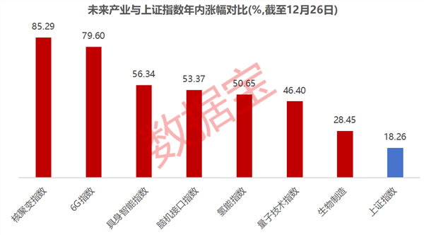 从市场表现来看,今年以来,未来产业备受资金青睐,上述7个未来产业年内均大幅跑赢市场。以万得产业指数来看,截至12月26日,核聚变指数年涨幅超过85%,第六代移动通信指数(6G指数)年涨幅接近80%,具身智能、脑机接口、氢能指数年涨幅均位于50%以上。