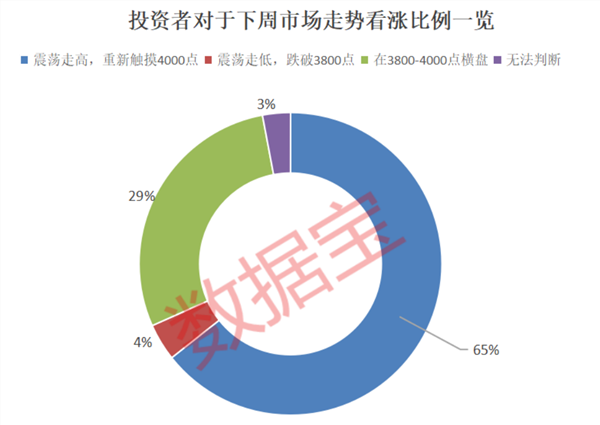 市场连续上涨,投资者信心回升,看涨的人数占比大幅提高,其中65%的投资者认为下周市场能重回4000点,近30%的投资者认为仍是横盘震荡,仅4%的投资者看空市场。