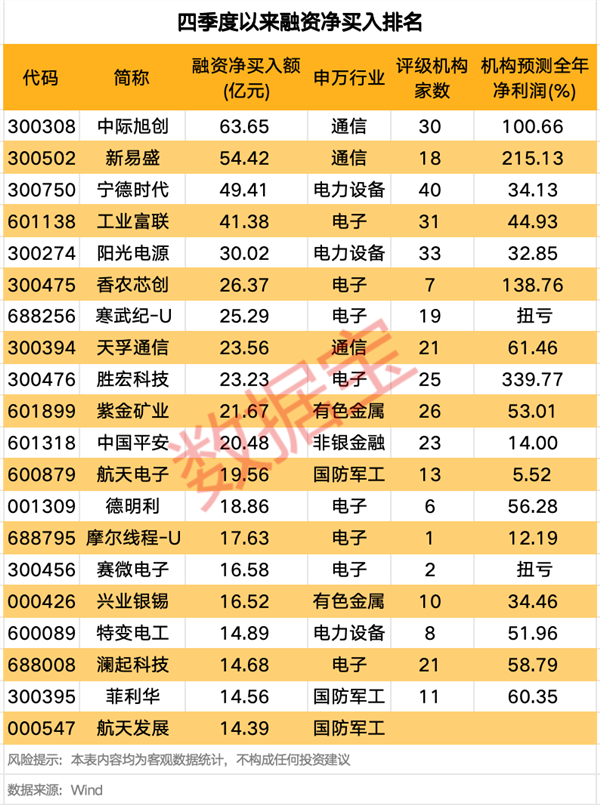 个股方面,32股四季度融资净买入额在10亿元以上。中际旭创、新易盛、宁德时代、工业富联、阳光电源排名前五,依次为63.65亿元、54.42亿元、49.41亿元、41.38亿元、30.02亿元;香农芯创、寒武纪-U、天孚通信、胜宏科技等6股随后,净买入额均在20亿元以上。