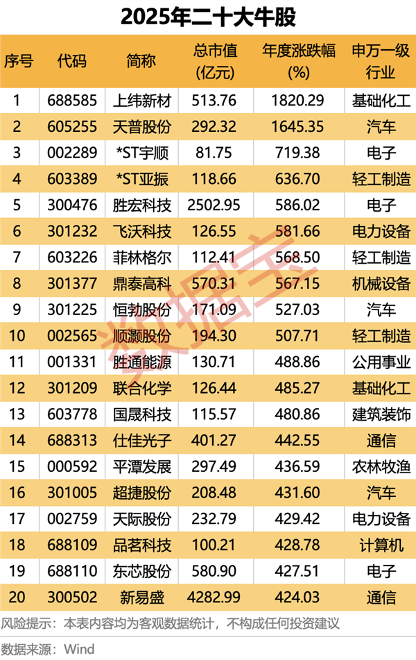 牛股方面,2025年,A股市场共计540股的股价实现翻倍增长。上纬新材、天普股份分别为第一、第二名,累计涨幅依次为1820.29%、1645.35%。其中,上纬新材由于智元机器人入主,市场关注度爆棚;而天普股份则是由于中昊芯英入主,股价节节攀升。