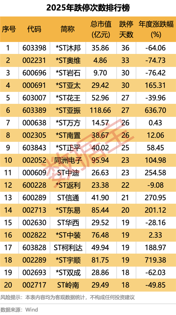 跌停方面,*ST沐邦、*ST奥维、*ST岩石、*ST亚太排名居前,全年跌停次数均在30次及以上。