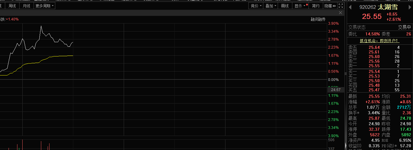 1月12日,太湖雪(920262)股价上涨,盘中涨幅一度接近4%。