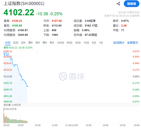 1月16日,A股三大指数早间集体高开,随后震荡下行。截至发稿,上证指数跌0.25%,深证成指跌0.19%,创业板指跌0.17%。