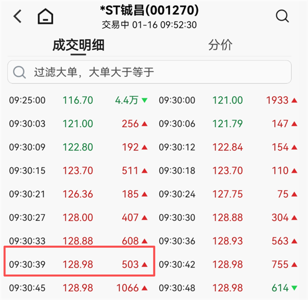 早间,*ST铖昌以116.7元/股的跌停价开盘;开盘后直线冲高,不到1分钟即拉出涨停板。截至发稿,*ST铖昌报128.98元/股,仍保持涨停状态;总市值为266亿元。