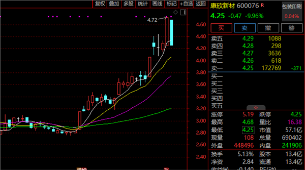 1月21日,康欣新材股价开盘大幅低开后跌停。
