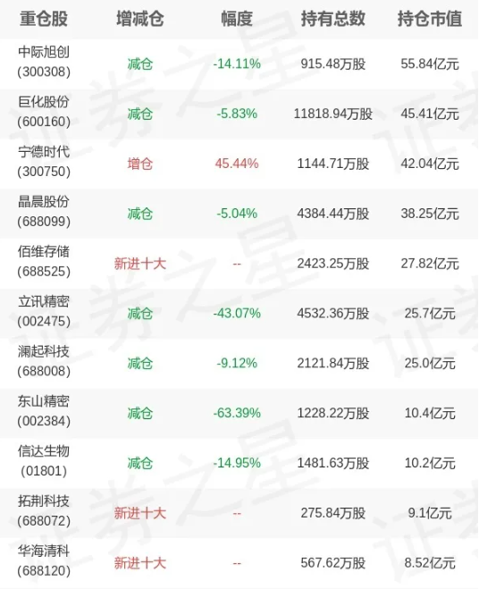 同时,谢还大手笔加仓了宁德时代(+45.44%);而对于中际旭创(-14.11)、立讯精密(-43.07)、东山精密(-63.39%)、信达生物(-14.95%)等则做了较大手笔的减持;北方华创、蓝思科技、分众传媒、中芯国际等则退出十大。