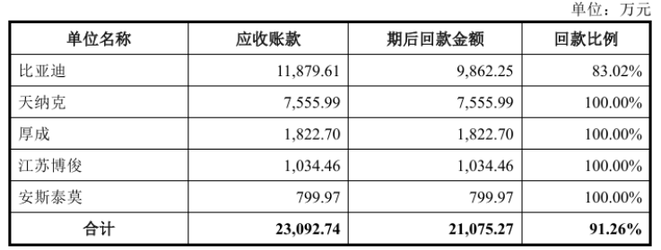由于综合信用周期较长,截至2025年7月31日,比亚迪2024年末应收账款期后回款比例为83.02%。而2024年前五大客户除比亚迪外,其余均于期后已回款。