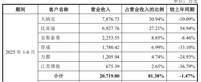 其中,天纳克各期均为第一大客户,其营收贡献分别为1.11亿元、1.49亿元、1.79亿元、7876.73万元,营收占比分别为26.69%、29.37%、31.57%、30.94%。不过2025年上半年,来自天纳克的营收同比下降了10.09%。根据第二轮问询,天纳克理想、奔驰系列2025年上半年收入同比分别下降776.18万元和169.91万元。