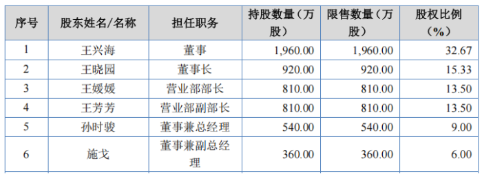 具体而言,王兴海家族为永励精密的控股股东和实控人,家族成员包含6名股东。其中王兴海及3个女儿王晓园、王媛媛、王芳芳分别持股32.67%、15.33%、13.5%、13.5%,王媛媛配偶孙时骏、王晓园配偶施戈分别持股9%、6%,上述6人合计持股90%。