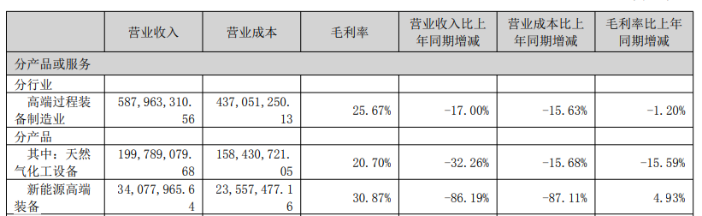 但科新机电的新能源产品收入却大幅收缩。2025年上半年,新能源高端装备营收同比直降86.19%,营收占比仅5.76%。此外,天然气化工设备、煤化工设备营收同比下滑32.26%、81.43%。石油炼化设备、油气装备营收同比增长182.94%、157.84%,对冲了其他产品的下跌。