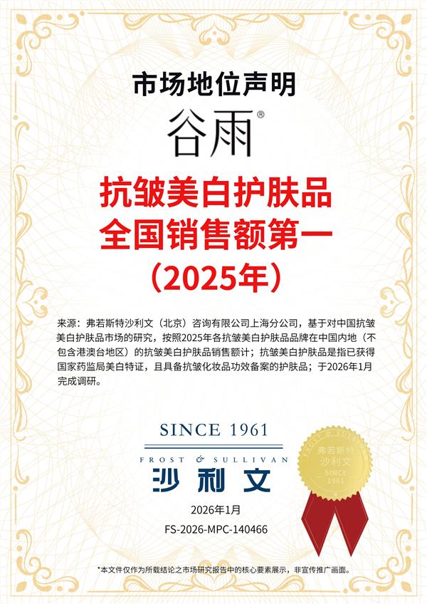 据悉,欧睿和沙利文作为世界权威的市场调研机构,全球范围内具有高度的科学性、专业性及权威性。此次认证,主要是对2021年以来,全国范围内中国美白品牌的美白特证产品销售情况,经案头调研 、行业访谈 、交叉验证及分析等数据调研方法,通过真实、客观、严谨的数据调研与行业分析所得出。这一认证结果,也从侧面印证了谷雨多年来深化科研布局,以原料自主创新实现功效弯道超车,以此赢得市场和消费者认可的成长范式正在显效。