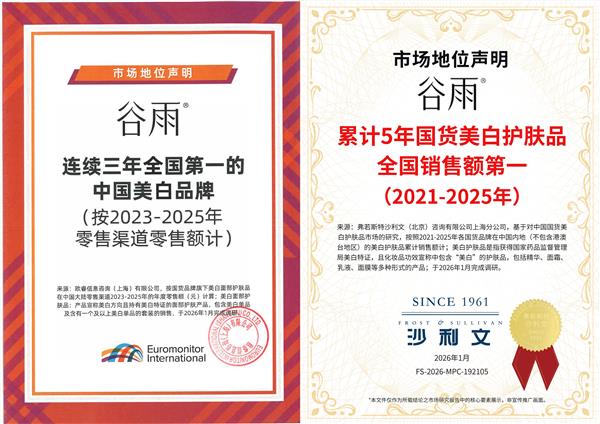 近期,国际权威市场调研机构欧睿信息咨询(Euromonitor,下称“欧睿”)及全球性企业增长咨询公司弗若斯特沙利文(Frost & Sullivan,下称“沙利文”)分别授予中国护肤品品牌谷雨“连续三年全国第一的中国美白品牌”和“累计5年国货美白护肤品全国销售额第一”的双“第一”权威认证,进一步巩固该品牌在行业中的美白领跑者地位。