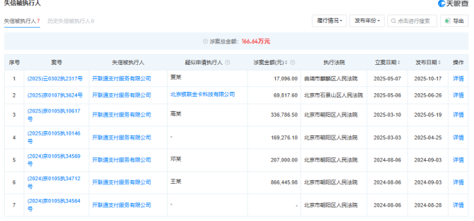 欠税之外,开联通支付还深陷法律纠纷与信用危机。中国执行信息公开网显示,该公司目前可查询的被执行信息已达21条,仅2025年就新增近20起,执行标的从数万元到20多万元不等,且已有7起案件被列入失信被执行人名单。